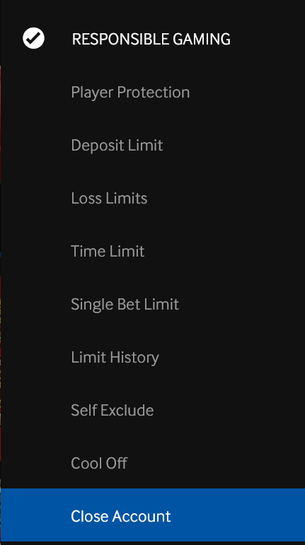 Betway believes in putting the power in your hands. Should you wish to close your account, you will be able to do so within the logged in product. Click on the menu option and go to the Responsible Gaming section under Player Account. You will find the Close Account option as shown below.