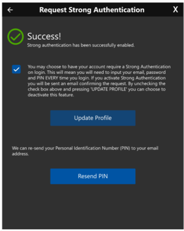 We currently offer a Strong Authentication login that you can enable on your account for added security. You can choose to have your account require Strong Authentication on login. This means that you must enter your email, password and PIN every time you log in. If you activate Strong Authentication you will be sent an email confirming the request.